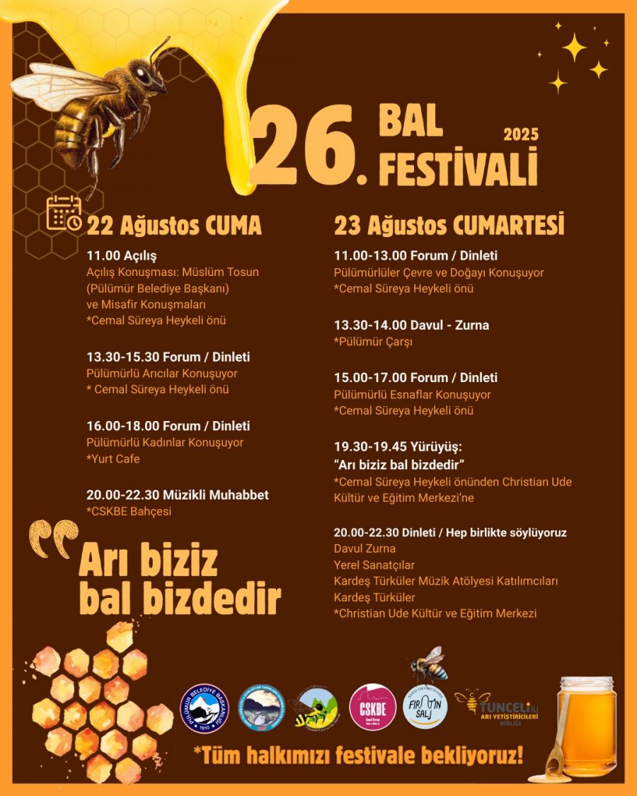 Kongre ve Fuarlar Arıcılık KongreleriArıcılık FuarlarıTarım FuarlarıArıcılık FestivaliArıcılık ÇalıştayıDünya Arı GünüArıcılık KonferansıArıcılık SemineriArıcılık Eğitimi 22-23 Ağustos 2025 Tunceli 26.Bal Festivali 22 Ağustos 2025
