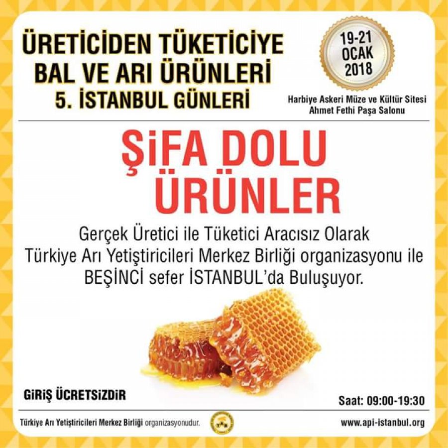 Kongre ve Fuarlar Arıcılık KongreleriArıcılık FuarlarıTarım FuarlarıArıcılık FestivaliArıcılık ÇalıştayıDünya Arı GünüArıcılık KonferansıArıcılık SemineriArıcılık Eğitimi 19-21 Ocak 2018 Üreticiden Tüketiciye Bal ve Arı Ürünleri 5.İstanbul Günleri 22 Kasım 2017