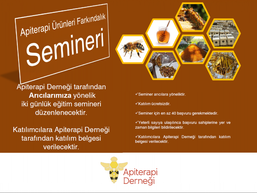 Apiterapi Derneği tarafından, Sağlık Bakanlığı personeli sertifikalı hekimler tarafından uygulanan apiterapi tedavisinde kullanılan apiterapi ürünlerinin niteliği, kalitesi, dikkat edilmesi gereken konular hakkında arıcılarımıza ve arı ürünleri üreten kurumsal firmalara yönelik iki günlük eğitim semineri düzenlenecektir.